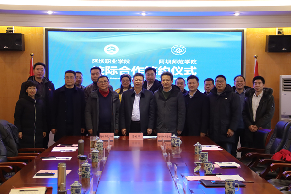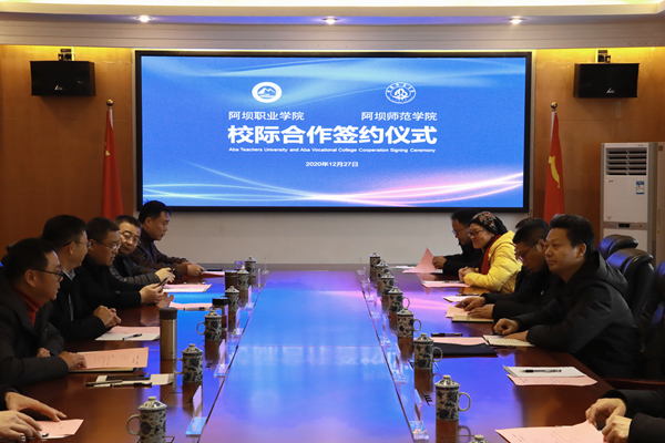 【本网讯】12月27日下午,阿坝师范学院于行政楼406会议室,与阿坝职业学院共同举行校际合作签约仪式。出席本次签约仪式的阿坝职业学院的代表有:阿坝职业学院党委副书记、副院长柴继贵,党委委员、副院长彭龙,学校组织人事部部长王洪林,学工部部长陈永兵,后勤处副处长肖兴文,财务资产处副处长郭光普,教务处副处长伍杰、卢永雪,团委书记苟宏伟,党政办公室工作人员王勇。阿坝师范学院党委副书记、校长向武,党委副书记、工会主席孙建平,副校长马昌威,学工部部长罗清杨,计财处处长覃才林,人事处副处长焦安勤,对外合作处副处长、校团委书记钟顺秋,教务处副处长袁甲参加此次签约仪式。签约仪式由孙建平主持。