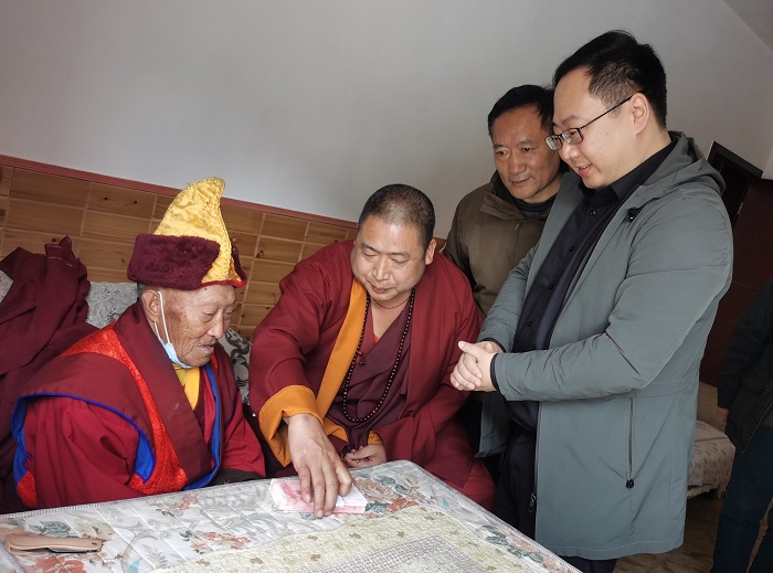 甲任副校长为僧人送上慰问品,与年近九十岁的阿旺尕让进行了交谈。阿旺尕让表示,感谢党和政府对他本人及寺院的关心,感谢甲任同志多次来看望他,并表示要做一名爱国僧人。