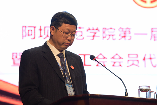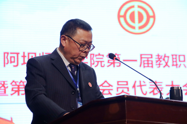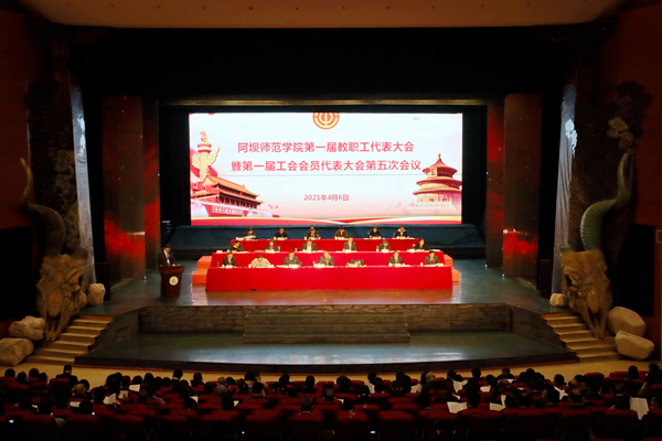 【本网讯】4月6日上午9:00,阿坝师范学院第一届教职工代表大会暨第一届工会会员代表大会第五次会议在桃园大剧院隆重召开。学校党委书记吴昊,党委副书记、校长向武,党委副书记、工会主席孙建平,省纪委监委驻学校纪检监察组组长、党委副书记、纪委书记雷健,副校长甲任、毛英、马昌威等93名正式代表,41名列席代表以及学生代表参加了此次会议。会议由孙建平主持。