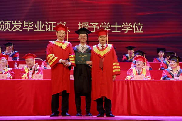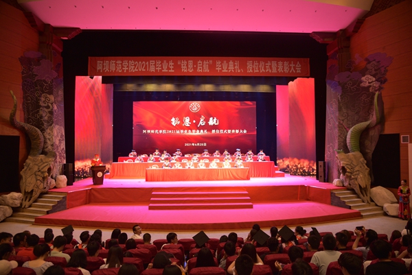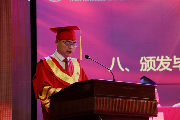 【本网讯】 6月25日上午9:00,我校2021届学生‘铭恩﹒启航’毕业典礼、授位仪式暨表彰大会在水墨桃源大剧院隆重举行。我校党委书记吴昊,党委副书记、校长向武,党委副书记、工会主席孙建平,省纪委监委驻校纪检监察组组长、学校党委副书记、纪委书记雷健,副校长毛英,副校长马昌威,党委常委、组织部部长刘伟,党委常委、宣传统战部部长郑文瑜及学校学士学位委员会委员、相关职能部门负责人、各二级学院党总支书记、学工办主任、综合办主任、毕业班辅导员、班主任、教师代表、学生代表与毕业生共同参加了毕业典礼。甲任副校长主持毕业典礼。