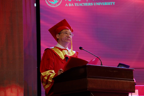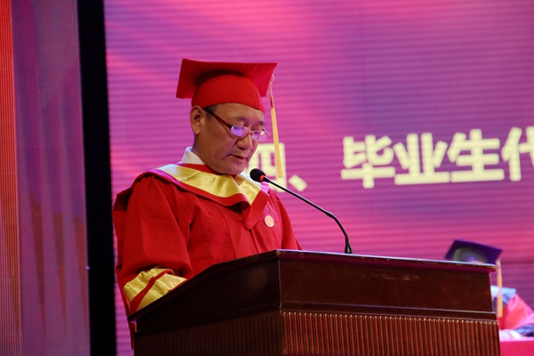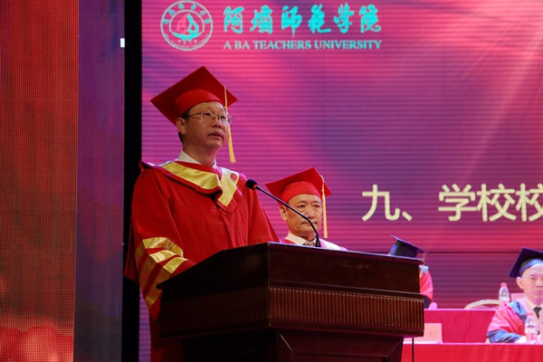 向武校长以《让青春在不懈奋斗中绽放绚丽之花》为题发表讲话。他首先向圆满完成学业、即将踏上更广阔人生征程的全体毕业生致以最热烈的祝贺!向辛勤培育同学们的父母、向悉心指导同学们的老师、向陪伴鼓励同学们的亲友致以最衷心的感谢。他讲到,四年前,同学们相遇阿师,四年后,同学们各奔东西。四年的青葱岁月里,同学们挥洒青春、筑梦年华,在阿师的每一次经历、每一个故事,都会镌刻为成长的印记;在阿师的每一次成就、每一件荣誉,都会定格成青春的记忆,值得我们彼此珍藏和铭记。他讲到,今年是中国共产党建党100周年,是“十四五”开局之年,也是全面建设社会主义现代化国家新征程开启之年。同学们见证了祖国前行的伟大历程,亲历了“两个一百年”奋斗目标交汇的新时代,迎来了中国共产党建党一百周年,你们既生逢其时,也重任在肩,你们既承载着特殊的历史际遇,也背负着光荣的时代使命。他对同学们提出四点希望:第一,自强不息,不懈奋斗。做到在人生航程上,乘风破浪,行稳致远,勇担时代重任,创造精彩未来,在奋斗中练就更多独门绝技。第二,实干笃行,知行合一。做到不驰于空想,不骛于虚声,实干笃行,严谨务实,苦干实干,锲而不舍。第三,铭记历史,厚植家国情怀。做到不畏困难,不惧牺牲,心系家国,舍生取义,把人生理想融入国家前途、人类命运中,不断升华人生格局和境界。第四,热爱生活,成就幸福人生。做到跳出舒适圈,在未来的道路上,勇攀高峰,始终朝着心之所向,一往无前,以健康饱满的生命态度成就美好人生。他衷心祝愿同学们带着母校的祝福与期盼,踏上全新的征程,投身到自己热爱的事业中,以广阔的国际视野和强烈的家国情怀思考规划自己的未来,以青春之我、奋斗之我,为祖国贡献青春力量。