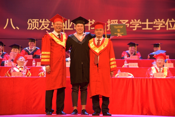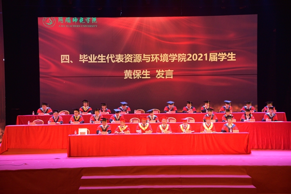 毕业典礼在庄严的国歌声中拉开帷幕。文学与传媒学院的谭歆培同学代表低年级同学发言时表达了对师兄师姐最诚挚的感谢和最美好的祝福。资源与环境学院的黄保生同学代表毕业生满怀深情地回顾了在阿师四年的学习生活的点点滴滴,表达了对母校的诚挚祝福,对恩师的深深感谢,对同窗的万般不舍,对未来的无限憧憬和雄心壮志。