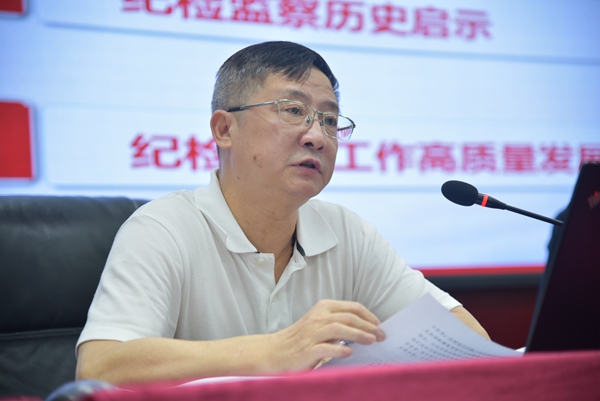 省纪委监委驻学校纪检监察组组长、党委副书记、纪委书记雷健作了题为《重温党史守初心 砥砺奋进担使命》的专题辅导报告,他从“建党以来的纪检监察历程”“纪检监察历史启示”“纪检监察工作高质量发展要求”三个方面全面回顾梳理了纪检监察历史,阐释了纪检监察史给予的深刻启示,并对推进纪检监察工作高质量发展提出了明确要求。