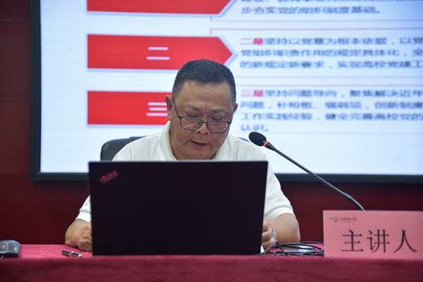 党委副书记、工会主席孙建平作了学习《中国共产党普通高等学校基层组织工作条例》专题辅导报告。他从“《条例》修订的背景、过程和意义”“修订的主要内容”“新时代高校党的建设的基本遵循”“《条例》新旧版对比”几个方面作了深入阐释。孙建平强调,《条例》修订实施是扎根中国大地办好中国特色社会主义大学的必然要求,是推动高质量教育体系建设的必然要求,是提高学校党建科学化水平的必然要求,各基层党组织要认真学习,抓好贯彻落实。