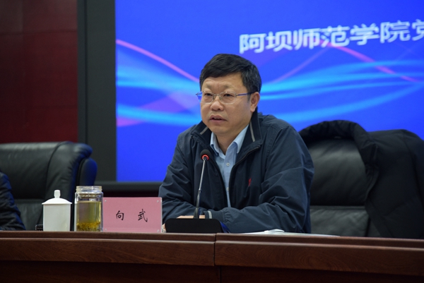 阿坝师范学院党委副书记、校长向武致辞。他总结了2021年汶川县南部学区工作取得的成就。针对如何推动南部学区建设,他强调,要继续坚定不移的走党建引领的南部学区建设之路,培育德、智、体、美、劳全面发展的学生。在党建方面,要坚持党的领导,坚持全面从严治党,以政治建设为统领,以保持党的先进性和纯洁性为主线来推动政治建设、思想建设、作风建设、组织建设。他讲到,要坚定不移的走协同育人的道路,开展一校一品的建设工作。他表明,南部学区工作已推动近五年,在各位领导的关心和各位教育工作者的努力下,已取得一定成效但还存在不足。最后,他分享了对于下一步工作的思考。