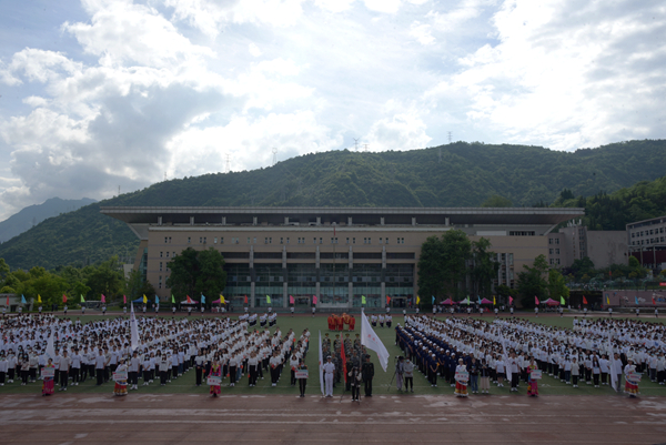 入场式上,伴随着激昂高亢的运动员进行曲,国旗护卫队率先入场,他们护卫国旗,步伐稳健,展示出我校感恩、奋进、务实、创新的校风。彩旗方队、裁判员代表队、教工组方队及14个学院方队迈着铿锵有力的步伐依次入场。他们一句句口号掷地有声、气吞山河,尽展阿师人的意气风发和朝气蓬勃。教师教育学院带来优美舞蹈,传递出勃勃生机。美术学院在主席台前展示行云流水的笔法,下笔如有神助。藏汉双语学院身着民族服饰,手举哈达,热情奔放,豪迈自信。体育与健康学院用花样跳绳跳出活力,多人舞龙舞动青春。