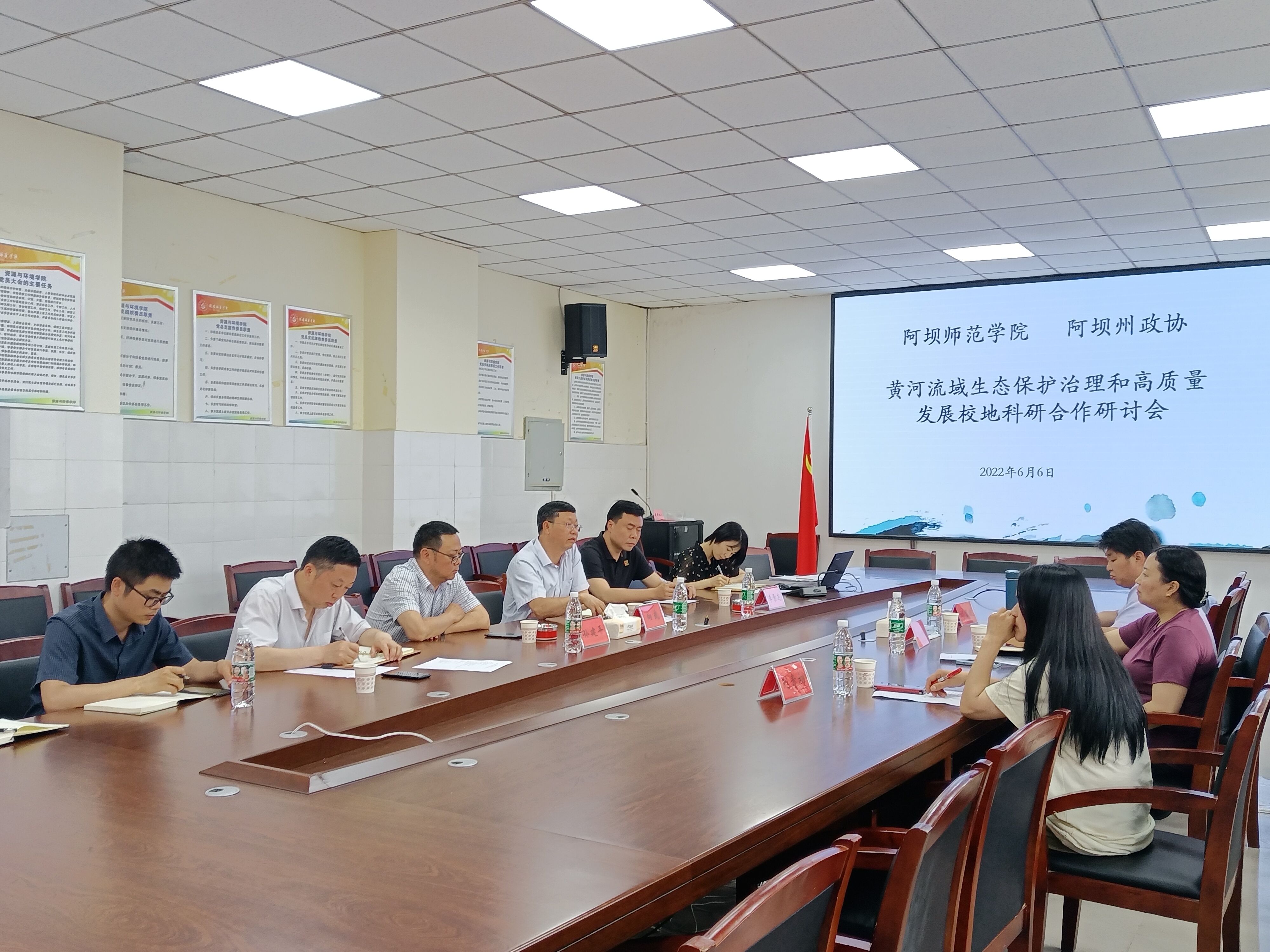 【本网讯】为更好地落实国家黄河流域生态保护和高质量发展重大战略,深化校地、县校合作,2022年6月6日下午阿坝师范学院与阿坝州政协召开了黄河流域生态保护治理和高质量发展校地科研合作研讨会。阿坝州政协祁玲副主席,人口资源环境委员会刘显波副主任,办公室主任列青初;阿坝师范学院向武校长,孙建平副书记,对外合作处钟顺秋处长共同参加研讨。资源与环境学院党委副书记余列、副院长王丽华、侯雨乐,地理科学教研室主任胡尧教授、地理学教师廖光萍教授、张茂超博士参加了会议。会议由王丽华副院长主持。