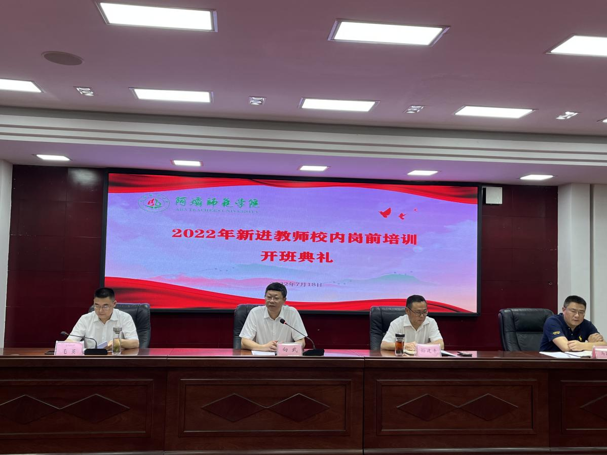 【本网讯】为深入学习贯彻落实党的十九届六中全会精神和省第十二次党代会精神,着力培养忠诚干净担当新时代高素质的教师队伍,持续强化教师立德树人的初心和提升教书育人的本领,7月18日上午,阿坝师范学院在行政楼二楼会议室举行2022年新进教师校内岗前培训开班典礼。学校党委副书记、校长向武,党委副书记孙建平,党委常委、副校长毛英,党委常委、副校长马昌威及相关部门负责人出席开班典礼。2021年9月--2022年7月期间新入职专任教师、辅导员、行政管理人员及其他未参加过校内组织培训的正式教职工等80名学员参加了开班典礼。党委常委、副校长毛英主持开班仪式,向武作开班致辞。