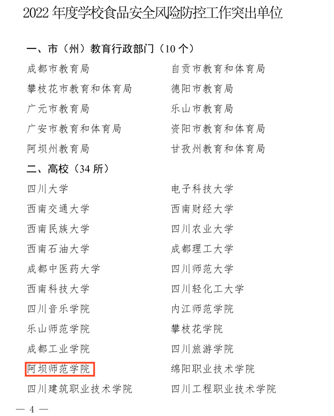 【本网讯】日前,四川省教育厅对21个市(州)教育主管部门和134所高校2022年度学校食品安全风险防控工作情况进行了复核评议。根据各地、各高校自查和实地复核情况,2023年8月3日,四川省教育厅发布了《四川省教育厅关于2022年度学校食品安全风险防控评议结果的通报》(川教函〔2023〕272号),对2022年度学校食品安全风险防控工作成绩突出的10个市(州)教育行政部门和四川大学等34所高校给予通报表扬。
