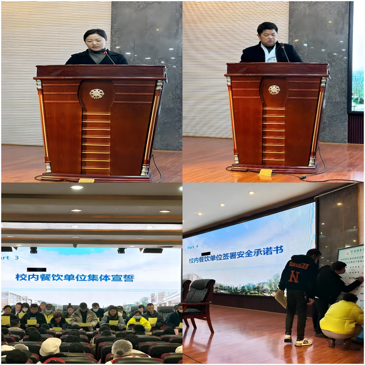 学生食堂餐饮公司代表张凤、社会餐饮单位代表占柳根就食品安全作汇报,一致表示本单位会严格落实食品安全各项工作,全方位强化食品安全,严格执行食品安全管理制度。随后,校内餐饮单位全体人员面对与会师生庄严宣誓并签署安全承诺书。