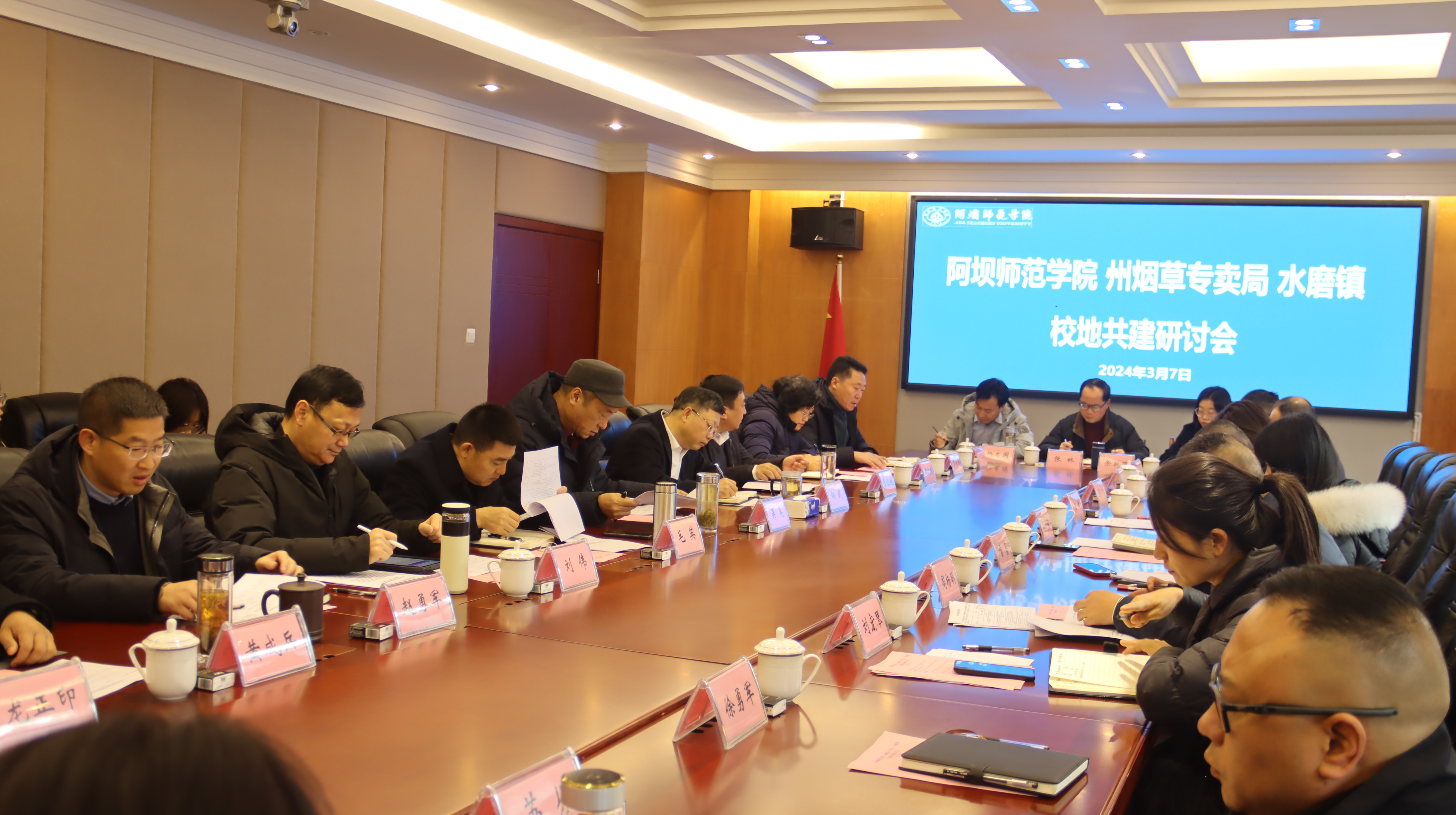 【本网讯】3月7日9:00,我校于行政楼406会议室联合水磨镇政府、州烟草专卖局开展校地共建研讨会,汶川县县委常委、组织部部长、水磨镇第一书记李小全,水磨镇党委书记王君,阿坝州烟草专卖局党建科科长雷蕾,我校党委书记吴昊,党委副书记、校长向武,党委副书记毛英,党委常委、副校长尕让他出席会议。会议由尕让他主持。