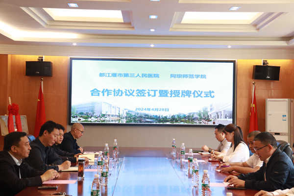 尕让他对来宾一行表示热烈欢迎,并对都江堰市第三人民医院长期以来关心关注并大力支持阿坝师范学院发展建设表示衷心感谢。他就学校的办学历史、办学定位以及理念特色作简要介绍。他指出,此次合作是推动校院发展的重要契机,希望双方能够不断加强在人才培养、心理健康教育等方面的合作交流。