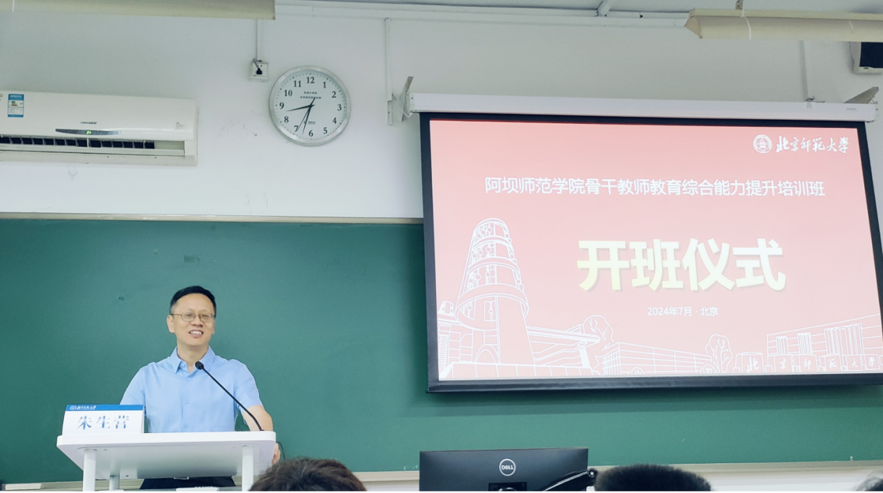 朱生营致欢迎辞。他指出,“强国必先强教,强教必先强师”。2022年4月教育部启动实施“师范教育协同提质计划”,北京师范大学作为提质计划组团牵头高校,有责任和担当助力阿坝师范学院高水平师范大学建设,推动提质举措落地见效。本次培训旨在帮助阿坝师范学院的骨干教师坚定理想信念,筑牢信仰之基,掌握教育教学的新知识、新方法、新理念和新技能,提高教育数字化转型能力,推进研究的深度和广度。他寄语参培学员要珍惜机遇,转变身份,带着问题学、带着问题听,加强与专家学者的互动与交流,结合工作实际积极探索,将所学变所用,将个人发展与学校发展紧密结合,致力成为推动学校未来发展的中坚力量。