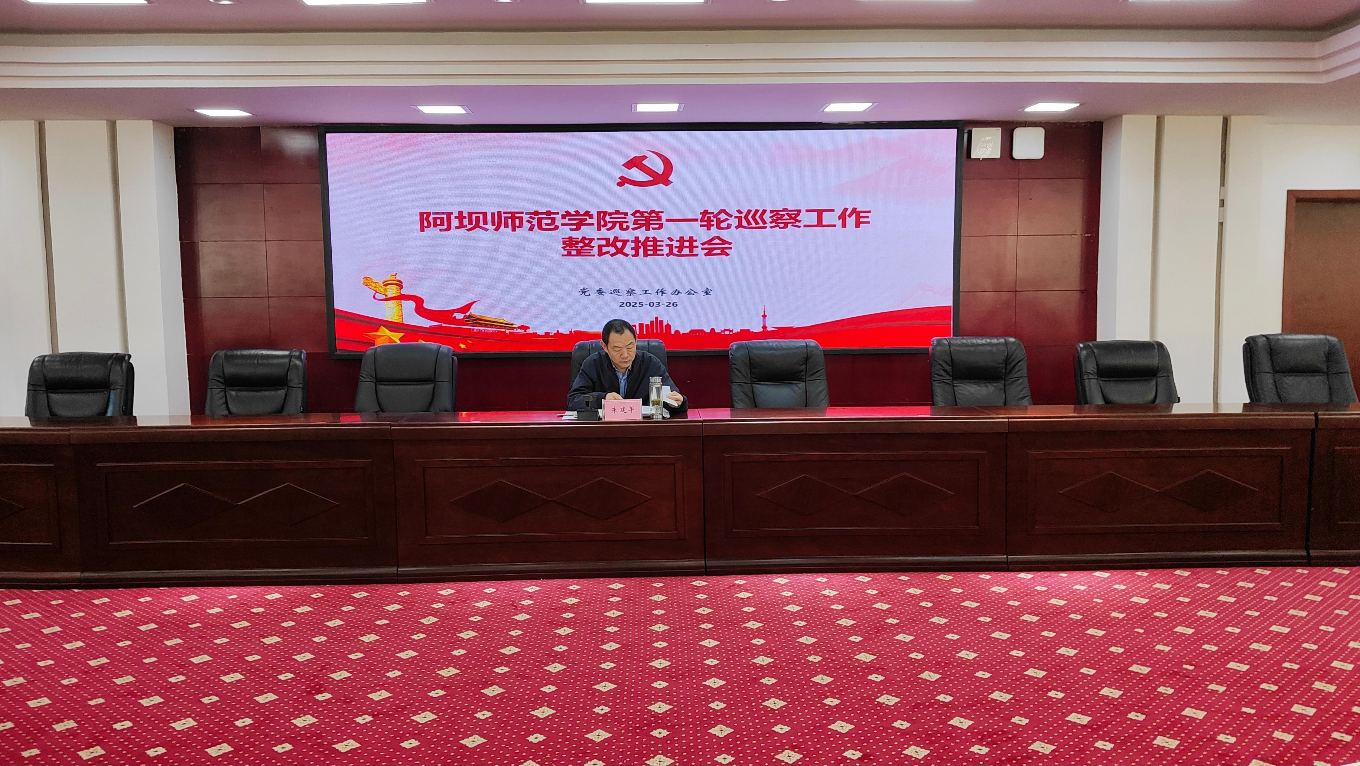 【本网讯】3月26日9:00,第一轮巡察整改推进会在学校行政楼二楼会议室召开。省纪委监委驻阿坝师范学院纪检监察组组长、党委副书记、纪委书记、巡察工作领导小组常务副组长朱建军出席会议并讲话。会议由学校巡察工作办公室副主任卜凡主持。