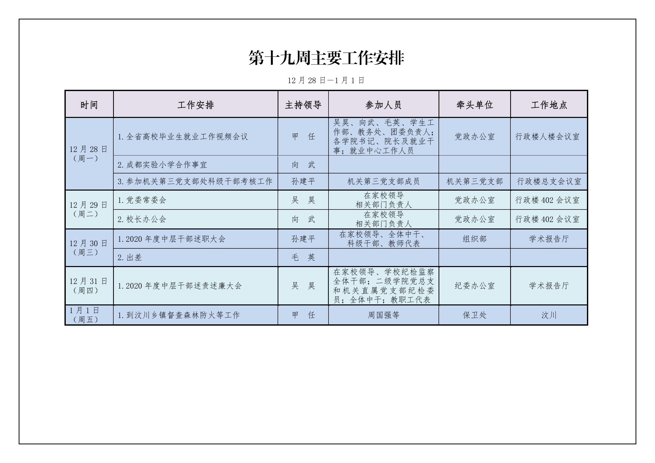 2020-2021学年度第一学期学校领导第十九周主要工作安排