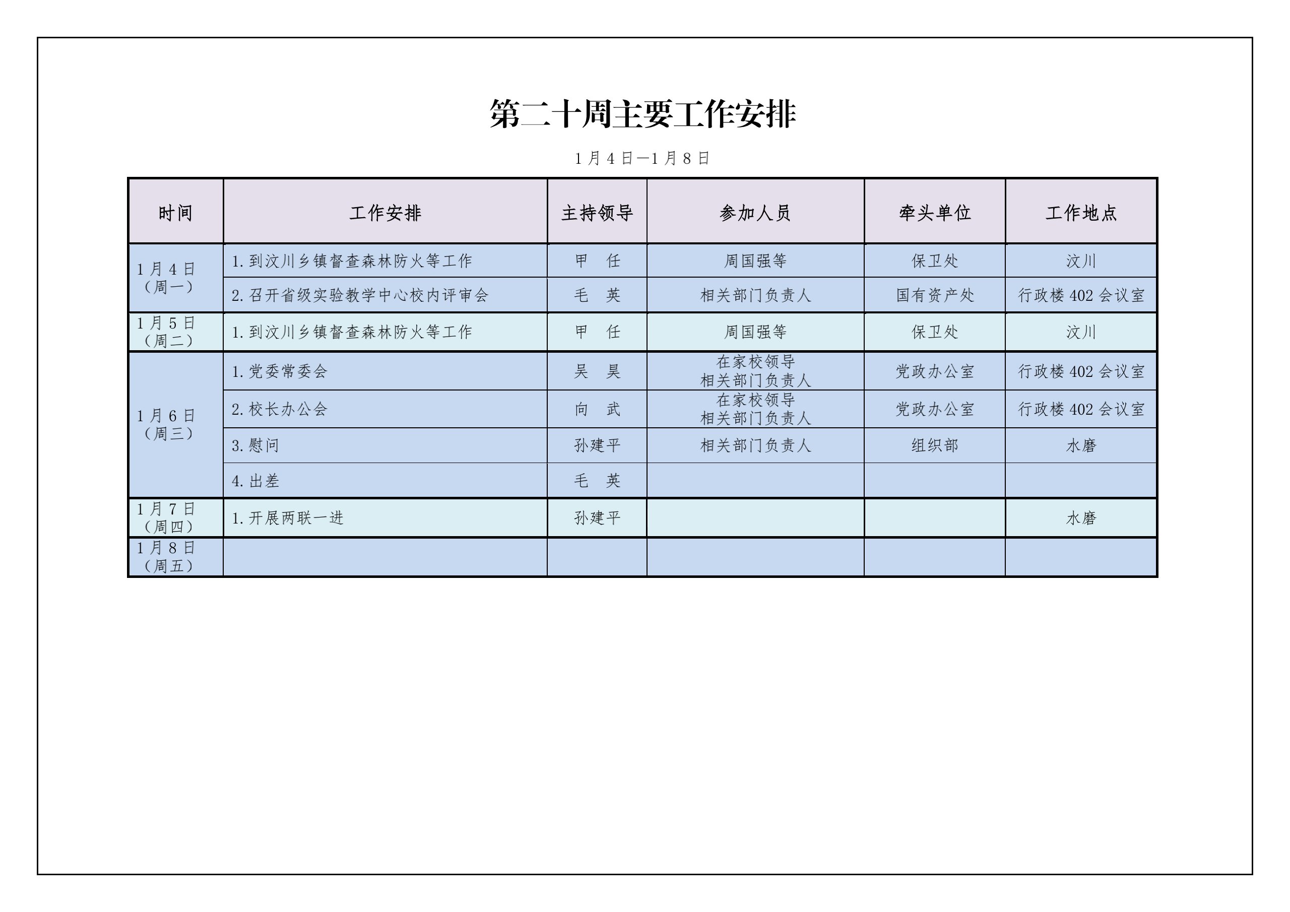 2020-2021学年度第一学期学校领导第十九周主要工作安排
