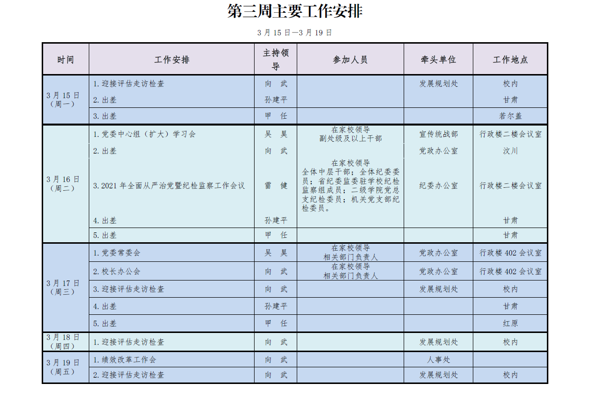2020-2021学年度第二学期学校领导第三周主要工作安排