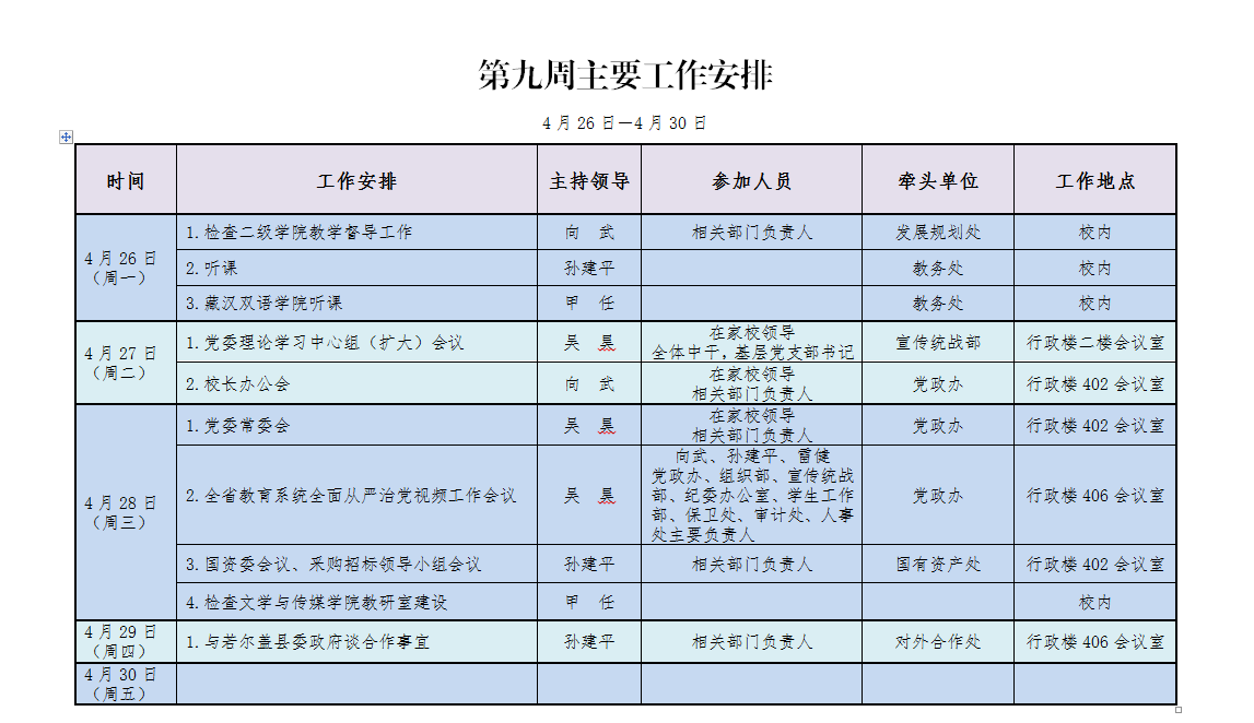 2020-2021学年度第二学期学校领导第九周主要工作安排