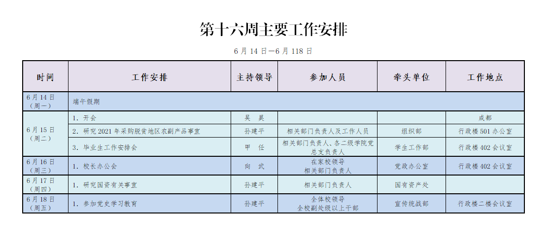 2020-2021学年度第二学期学校领导第十六周主要工作安排