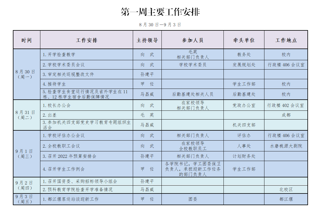 2021-2022学年度第一学期学校领导第一周主要工作安排