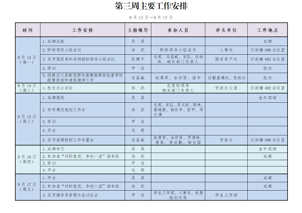 2021-2022学年度第一学期学校领导第二周主要工作安排