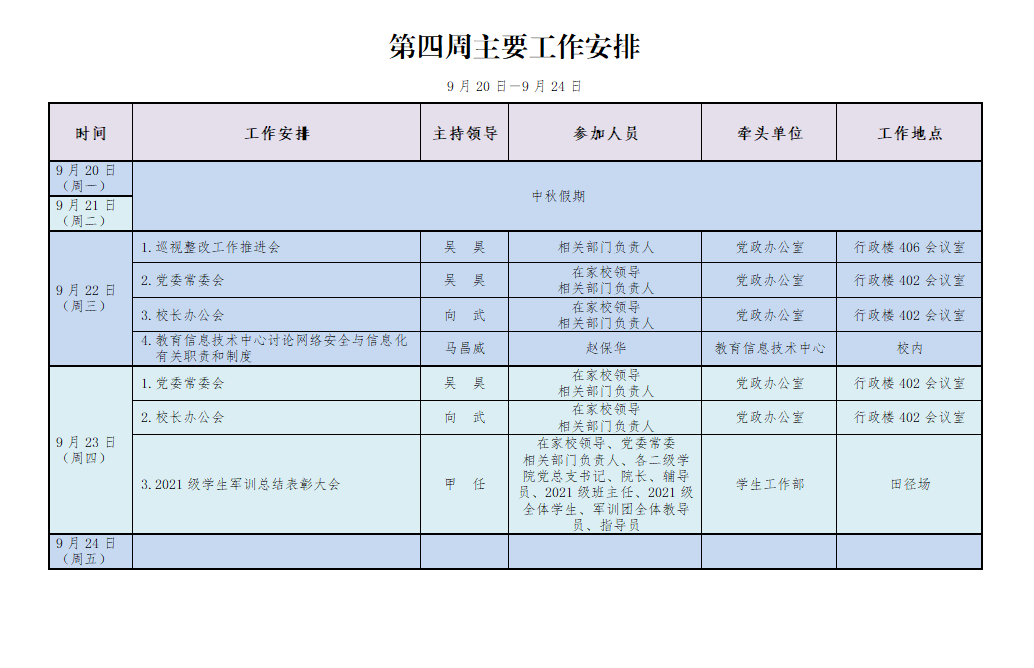 2021-2022学年度第一学期学校领导第四周主要工作安排