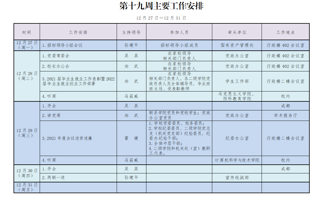 2021-2022学年度第一学期学校领导第十九周主要工作安排